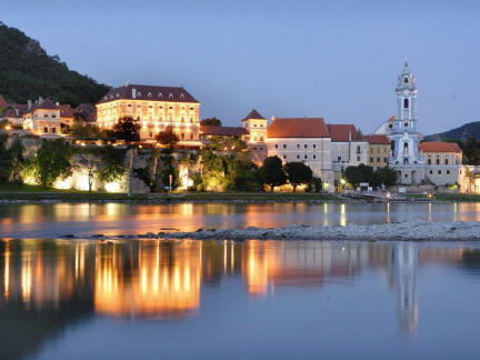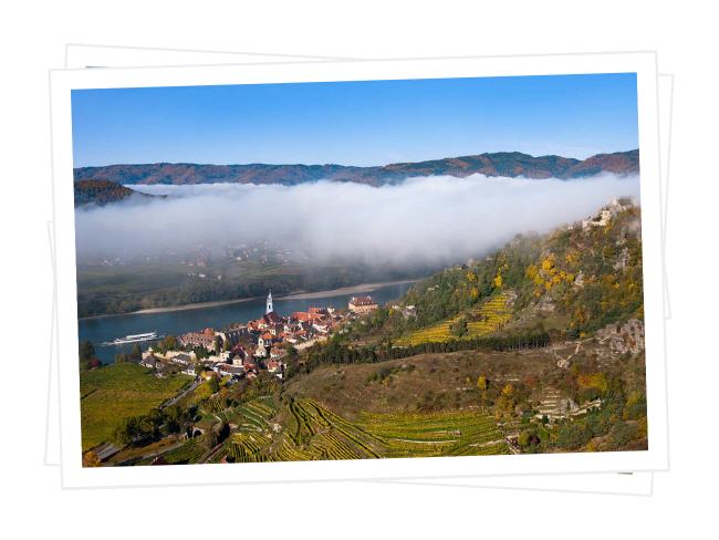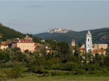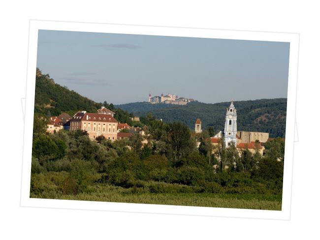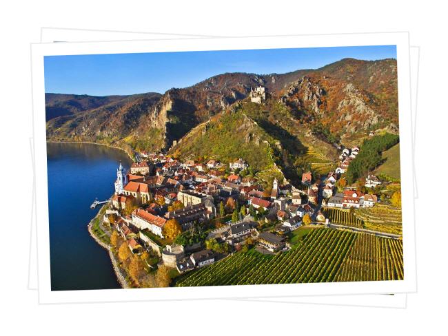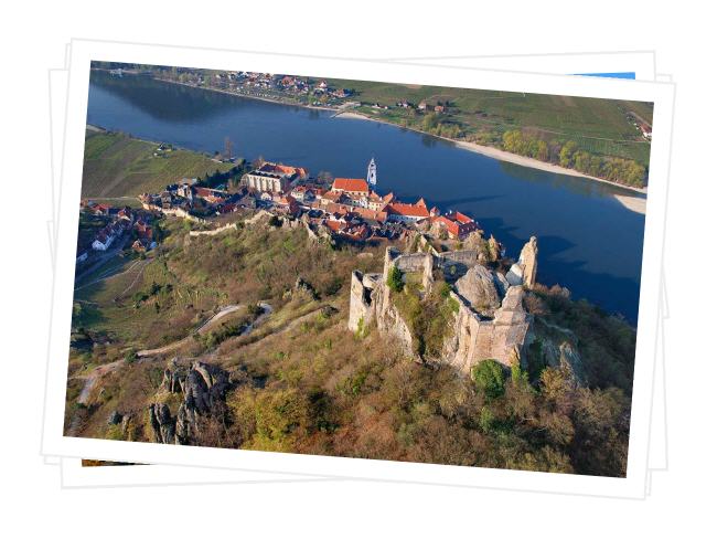 Dürnstein erhebt sich auf einem Plateau zwischen Donau und steil ansteigenden Ursteinsfelsen aus einem Meer von Weinreben. Jahrhundertealte Befestigungsmauern begrenzen den Ort, der im Jahr 1997 sein 650-jähriges Stadtjubiläum feierte.